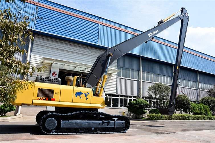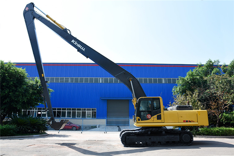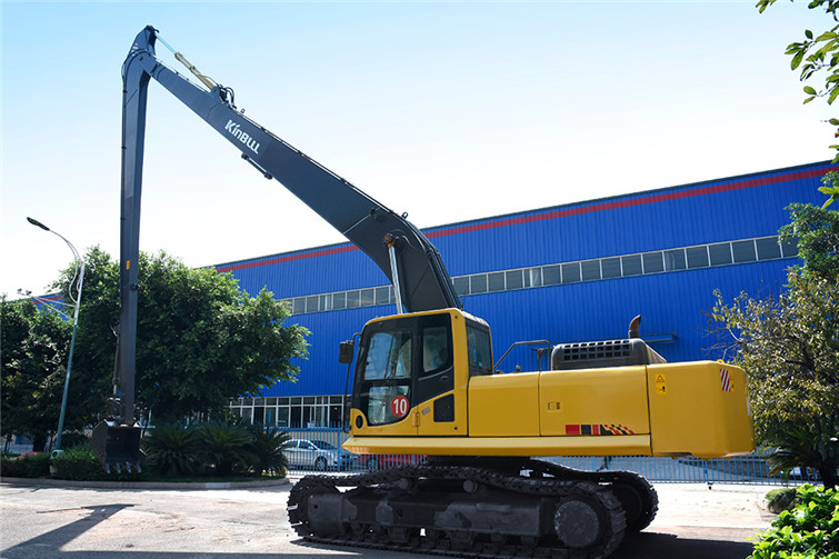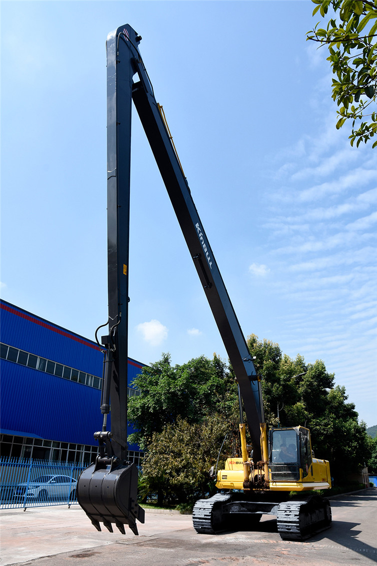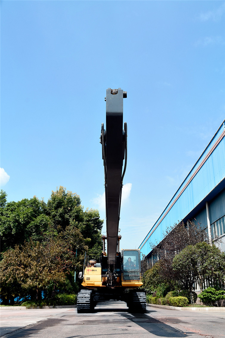 必一36T两段式加长臂履带式挖机,动臂长12米,斗杆长9米,共计21米,其挖掘高度,挖掘深度,挖掘半径都得到了显著提升,利用这种超长型动臂和超长型斗杆,操作者可在受地面影响的特殊工况下轻松实现挖掘功能,发挥其巨大威力。广泛适用于土砂、混凝土等建筑搬运, 楼体拆解, 地铁出入口开挖,高速公路坡面修整, 河道疏通清淤及建筑基础、深沟等土石方挖掘作业,能完成标准挖掘机不能完成的特殊任务。 而今全国各地纷纷上马地铁建设,河道疏浚治污工程遍地开花,细分市场生机勃勃,占领一席之地,必一势在必行!